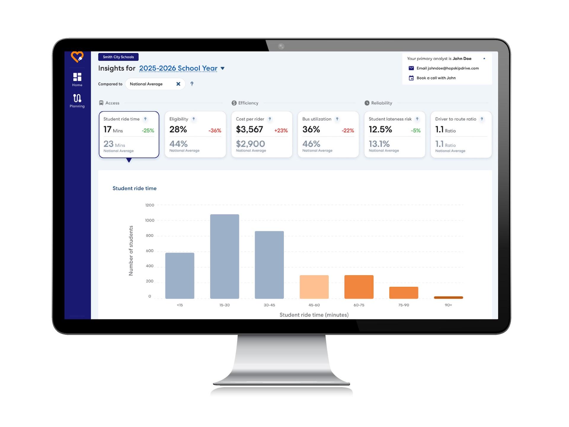 Why? We need major advancements for school districts focused on safe, reliable, and efficient transportation options. HopSkipDrive understands the need to provide comprehensive visibility into unlimited scenarios and national benchmarks.
