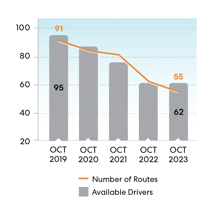 D11 initially budgeted for 112 drivers for the 2022-2023 school year, yet only 61 drivers started the year; D11 had lost 36% of their drivers since 2019 and were operating with more routes than drivers.