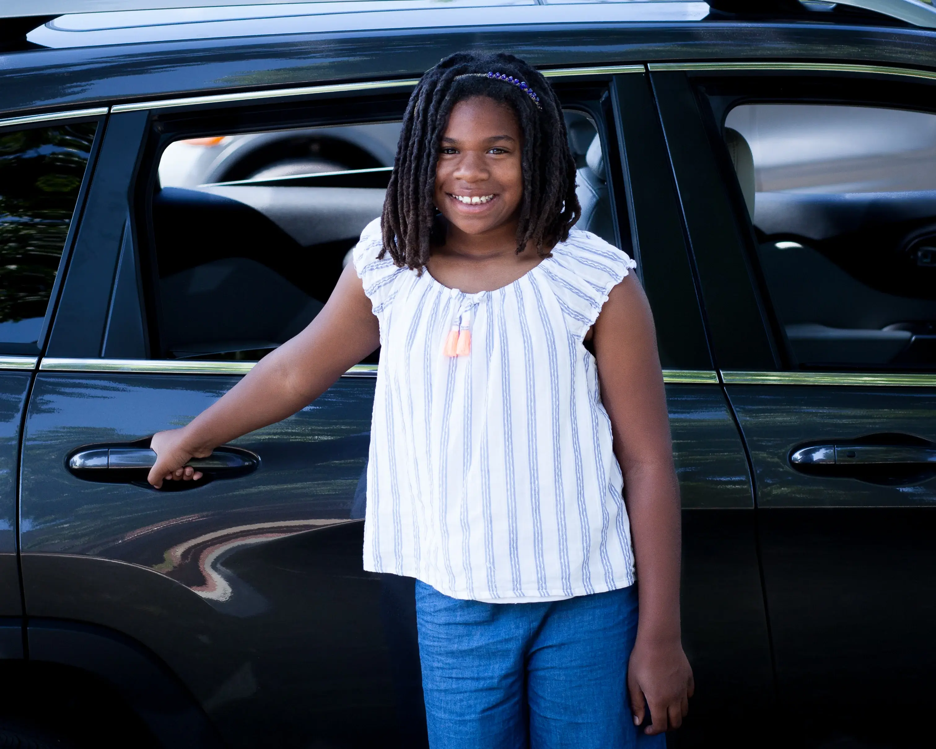 Driver in orange HopSkipDrive t-shirt standing by car door with young student passenger in school uniform seated inside